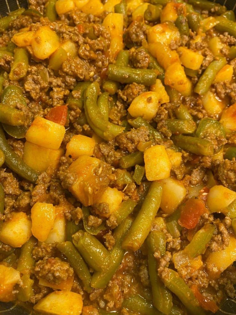 Directions : Add the evoo to a skillet add potatoes cook until browned and cooked through, remove from pan. Add ground beef, garlic and onions and spices cook until browned add tomatoes and Serrano cook until thick add potatoes and simmer 5 minutes and done! Enjoy !!