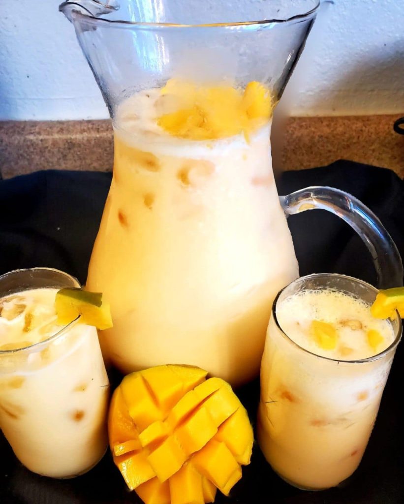 Directions: Shave 4 mangos and cut into peices then blend with evaporated milk and sweet condensed milk. I only used half a can since its very sweet. Add mix to your pitcher with 3 cups of water , give it a couple stirs and serve cold or with ice. Enjoy