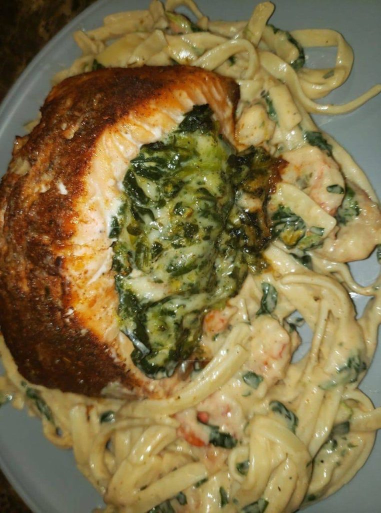 Blackened Salmon stuffed with spinach and parmesan cheese