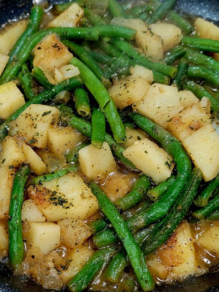 Ingredients: 2 lbs fresh green beans, trimmed 2 Russet potatoes diced in 1 inch cubes 1/2 onion diced 2 Tbsp minced garlic 1 tsp EVOO to coat bottom of pan 1/2 c vegetable stock (may use chicken stock or water) 1 tsp Paul Prudehome’s vegetable magic 1/2 tsp onion powder 1/4 tsp cracked pepper 1 […]