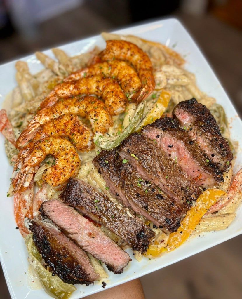Steak and shrimp jerk pasta