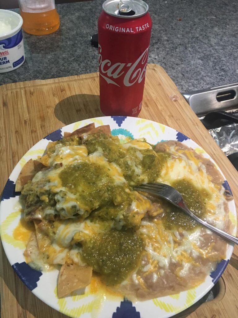 Authentic Green chilaquiles with Cheesy Refried Beans